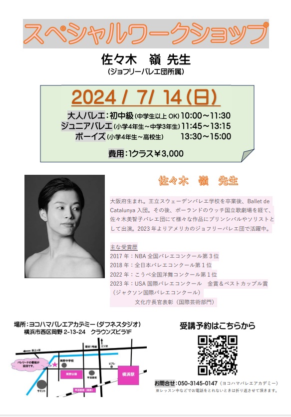 去年のUSA国際バレエコンクール(ジャクソンバレエコンクール)にて金賞とベストパートナー賞を受賞され、現在アメリカのジョフリーバレエ団にてご活躍されている佐々木嶺先生のスペシャルワークショップを開催します。あるもも出場したジャクソンにて嶺先生のリハーサルなどに立ち会わせて頂いたり通訳として様々貴重な経験をさせて頂いてからのご縁で、今回帰国時のお忙しい中ワークショップをしていただけることになりました。